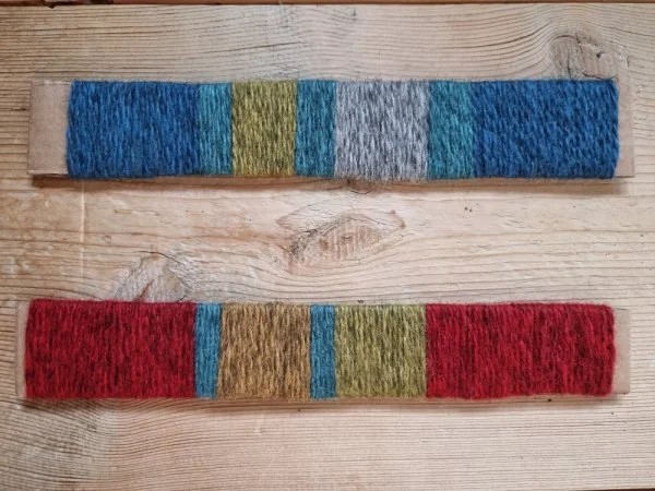 Doch wie sollte ich die Streifen gestalten? Schwierig. Wie immer begann ich mit dem Garn: wieviel hatte ich von welcher Farbe und wieviel in Prozent des totalen Garns? Das erlaubte mir, die Streifengrösse der Farben innerhalb des Rapports zu berechnen. Ich entschied mich für eine Decke in kalten und eine in warmer Grundfarbe und erstellte Farbentwürfe in Weavepoint: dort konnte ich gut sehen, was passt und was nicht. Das geht sehr schnell, in fast genau den richtigen Farben. Zum Beispiel: Rot neben Grünfarben funktioniert gut, einmal kaltes und einmal warmes Grün, sie sind Komplementärfarben. Rot neben warmem Senfgelb war ok, aber langweilig. Aber das Senfgelb funktionierte bestens im Kontrast zum kühlen Blaugrün.